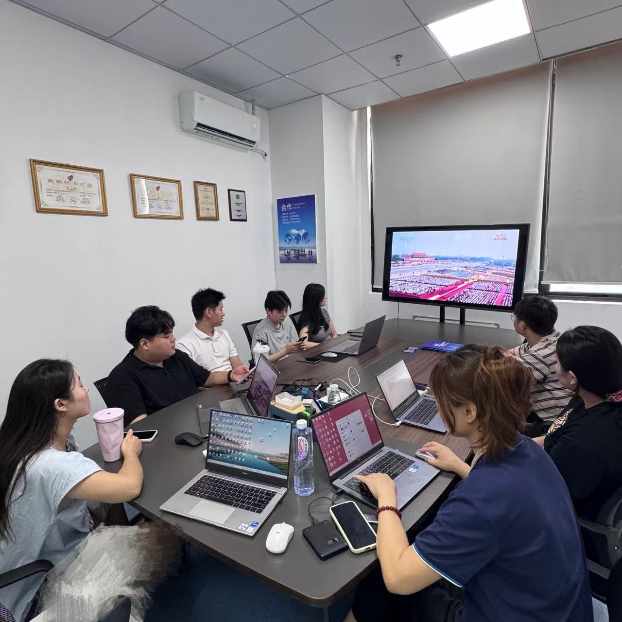 上午9时,员工们准时聚集在公司会议室,怀着激动的心情等待阅兵开始 。当阅兵仪式正式拉开帷幕,庄严的国歌奏响,全场员工起身肃立,齐唱国歌,目光坚定地注视着屏幕中的五星红旗冉冉升起。